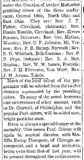And, here is another newspaper article mentioning Elvero Persons as one of 12 presiding elders of the Methodist church directing a seasonal event in Lakeside, Ohio. (Source: The Morning Star; Monday, June 6, 1898; Sandusky, Ohio; p. 2)